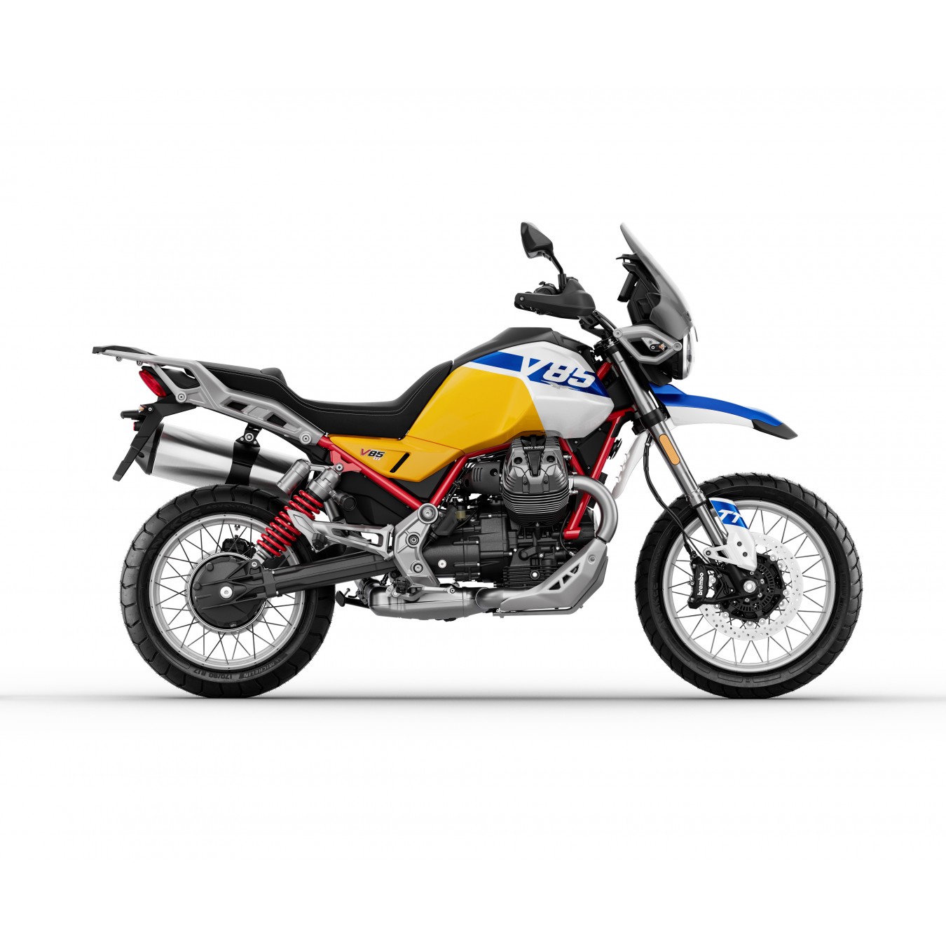 Αυθεντική και με στυλ, η V85 TT ενθουσιάζει ακόμα και πριν ανεβείς στη σέλα με την υποβλητική εμφάνισή της. Ο δυναμισμός των δίχρωμων κουστουμιών και το κόκκινο φινίρισμα στο πλαίσιο και το ελατήριο αμορτισέρ (ρυθμιζόμενο στην προφόρτιση) συνδυάζονται με τα πιο off-road χαρακτηριστικά, όπως η ποδιά αλουμινίου και τα προστατευτικά χεριών.