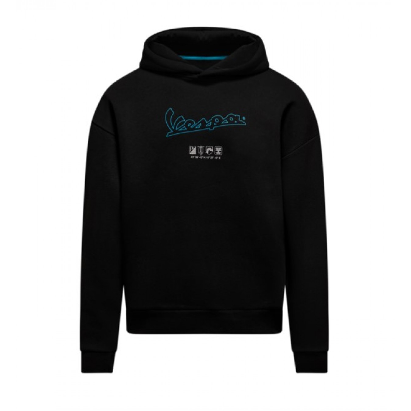 Άνετη και ζεστή μπλούζα με κουκούλα από απαλό και βουρτσισμένο βαμβακερό ύφασμα. Με το εμβληματικό λογότυπο Vespa και τα νέα γραφικά Vespa DEC στο μπροστινό μέρος και μια αποκλειστική τυπωμένη ετικέτα στο εσωτερικό.