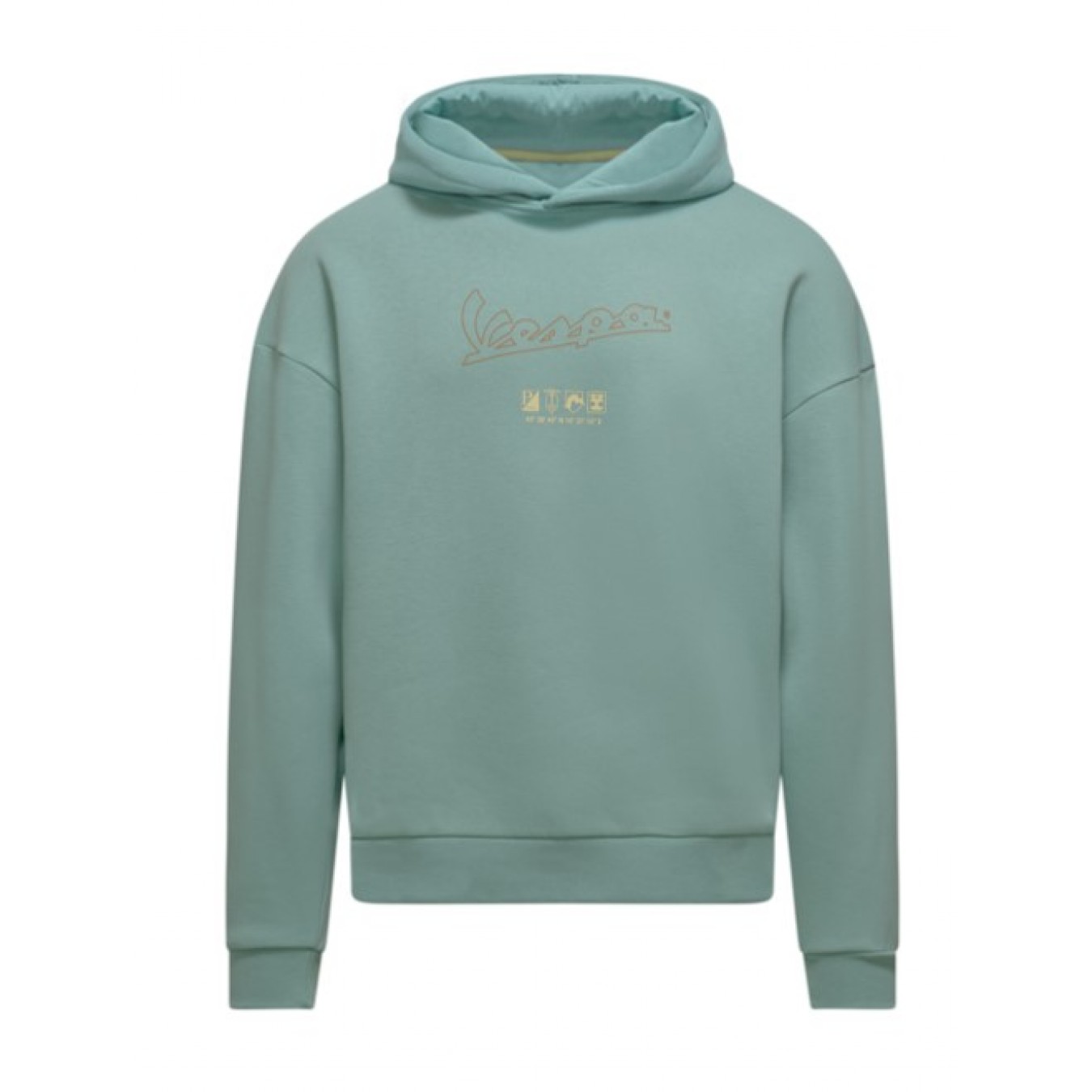 Άνετη και ζεστή μπλούζα με κουκούλα από απαλό και βουρτσισμένο βαμβακερό ύφασμα. Με το εμβληματικό λογότυπο Vespa και τα νέα γραφικά Vespa DEC στο μπροστινό μέρος και μια αποκλειστική τυπωμένη ετικέτα στο εσωτερικό.