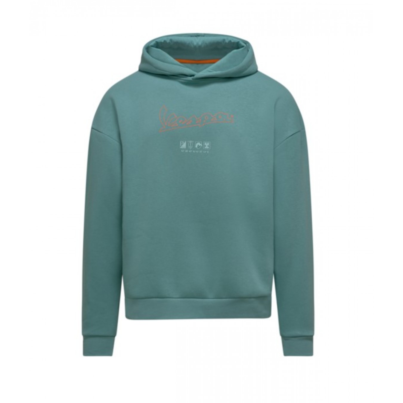 Άνετη και ζεστή μπλούζα με κουκούλα από απαλό και βουρτσισμένο βαμβακερό ύφασμα. Με το εμβληματικό λογότυπο Vespa και τα νέα γραφικά Vespa DEC στο μπροστινό μέρος και μια αποκλειστική τυπωμένη ετικέτα στο εσωτερικό.