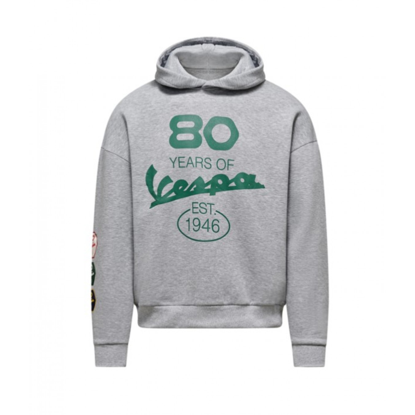 Αυτό το αναμνηστικό φούτερ με κουκούλα γιορτάζει την 80ή επέτειο της Vespa με ένα τολμηρό σχέδιο εμπνευσμένο από την κληρονομιά. Διατίθεται σε σκούρο μπλε και γκρι μελανζέ, διαθέτει κλασική σιλουέτα με κουκούλα με ριμπ μανσέτες και στρίφωμα για άνετη εφαρμογή. Το μπροστινό μέρος αναδεικνύει το γραφικό «80 Χρόνια Vespa – Ιδρύθηκε το 1946» σε μια εκτύπωση με αντίθεση, ενώ το πίσω μέρος τονίζει τη δήλωση «80 Χρόνια ενός Εμβλήματος». Κάθε χρωματικός συνδυασμός περιλαμβάνει ασορτί επετειακά σήματα που ενισχύουν τη συλλεκτική φύση του κομματιού. Ένα ευέλικτο και διαχρονικό φούτερ με κουκούλα που ενσαρκώνει την κληρονομιά της Vespa μέσα από καθαρές γραμμές, εμβληματικό branding και καθημερινή άνεση.